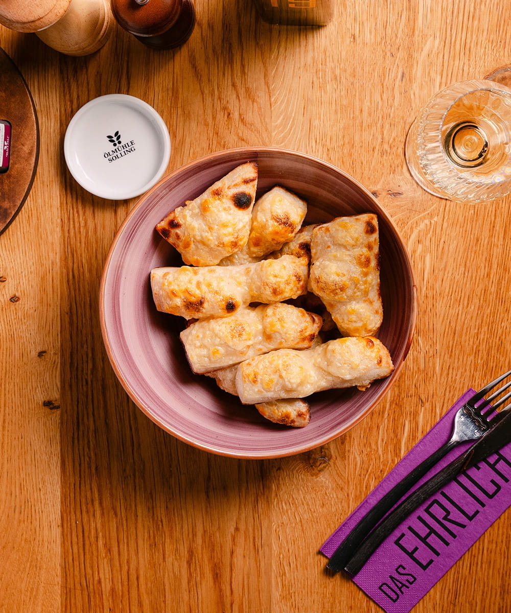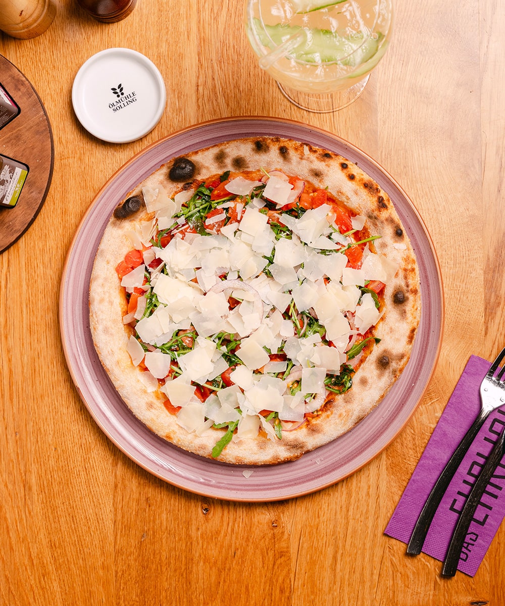 Bruschetta – mit MUTTI di popla & Gouda überbacken & frischem Rucola, Tomaten, roten Zwiebeln & Parmesan